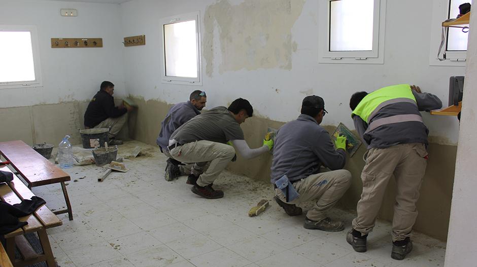 Las mejoras en el campo de fútbol municipal centran la recta final del proyecto experiencial de empleo y formación del Ayuntamiento de Almuniente-Frula. Ahora mismo, sus alumnos-trabajadores están llevando a cabo diversas actuaciones en los vestuarios, que tienen como objetivo principal eliminar las humedades, con el repicado y eliminación de los enfoscados dañados y la creación de un nuevo perímetro con cal, es decir, un material más transpirable. Antes, llevaron a cabo además la renovación del muro entre el campo de fútbol y el colegio.